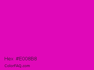Hex #e008b8 Color is a normal magenta color and the nearest color is Deep Magenta #cc00cc. Hex code #e008b8 and RGB value is rgb(224,8,184). In RGB color space, this color is composed of 88% red, 3% green, 72% blue, In CMYK color space, this color is composed of 0% cyan, 96% magenta, 18% yellow , 12% black , In HSL color space, this color has a hue angle of 311° , 93% saturation and 45% lightness.
