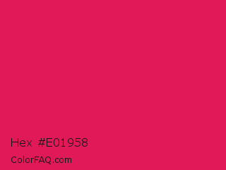 Hex #e01958 Color is a normal rose color and the nearest color is Ruby #e0115f. Hex code #e01958 and RGB value is rgb(224,25,88). In RGB color space, this color is composed of 88% red, 10% green, 35% blue, In CMYK color space, this color is composed of 0% cyan, 89% magenta, 61% yellow , 12% black , In HSL color space, this color has a hue angle of 341° , 80% saturation and 49% lightness.