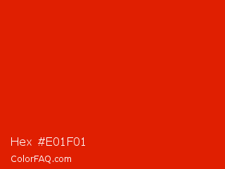 Hex #e01f01 Color is a normal red color and the nearest color is Scarlet #ff2400. Hex code #e01f01 and RGB value is rgb(224,31,1). In RGB color space, this color is composed of 88% red, 12% green, 0% blue, In CMYK color space, this color is composed of 0% cyan, 86% magenta, 100% yellow , 12% black , In HSL color space, this color has a hue angle of 8° , 99% saturation and 44% lightness.