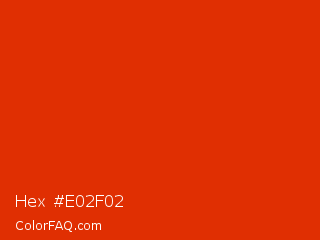 Hex #e02f02 Color is a normal red color and the nearest color is Grenadier #d54600. Hex code #e02f02 and RGB value is rgb(224,47,2). In RGB color space, this color is composed of 88% red, 18% green, 1% blue, In CMYK color space, this color is composed of 0% cyan, 79% magenta, 99% yellow , 12% black , In HSL color space, this color has a hue angle of 12° , 98% saturation and 44% lightness.