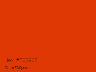 Hex #e03805 Color is a normal red color and the nearest color is Grenadier #d54600. Hex code #e03805 and RGB value is rgb(224,56,5). In RGB color space, this color is composed of 88% red, 22% green, 2% blue, In CMYK color space, this color is composed of 0% cyan, 75% magenta, 98% yellow , 12% black , In HSL color space, this color has a hue angle of 14° , 96% saturation and 45% lightness.