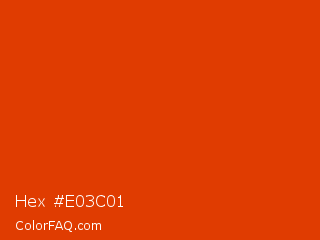Hex #e03c01 Color is a normal orange color and the nearest color is Grenadier #d54600. Hex code #e03c01 and RGB value is rgb(224,60,1). In RGB color space, this color is composed of 88% red, 24% green, 0% blue, In CMYK color space, this color is composed of 0% cyan, 73% magenta, 100% yellow , 12% black , In HSL color space, this color has a hue angle of 16° , 99% saturation and 44% lightness.