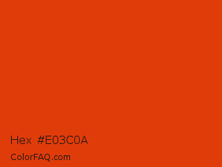 Hex #e03c0a Color is a normal red color and the nearest color is Grenadier #d54600. Hex code #e03c0a and RGB value is rgb(224,60,10). In RGB color space, this color is composed of 88% red, 24% green, 4% blue, In CMYK color space, this color is composed of 0% cyan, 73% magenta, 96% yellow , 12% black , In HSL color space, this color has a hue angle of 14° , 91% saturation and 46% lightness.