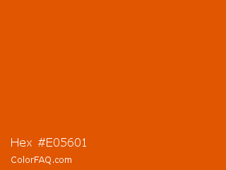 Hex #e05601 Color is a normal orange color and the nearest color is Trinidad #e64e03. Hex code #e05601 and RGB value is rgb(224,86,1). In RGB color space, this color is composed of 88% red, 34% green, 0% blue, In CMYK color space, this color is composed of 0% cyan, 62% magenta, 100% yellow , 12% black , In HSL color space, this color has a hue angle of 23° , 99% saturation and 44% lightness.