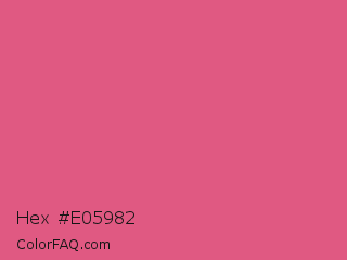 Hex #e05982 Color is a light rose color and the nearest color is Blush #de5d83. Hex code #e05982 and RGB value is rgb(224,89,130). In RGB color space, this color is composed of 88% red, 35% green, 51% blue, In CMYK color space, this color is composed of 0% cyan, 60% magenta, 42% yellow , 12% black , In HSL color space, this color has a hue angle of 342° , 69% saturation and 61% lightness.