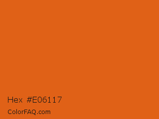 Hex #e06117 Color is a normal orange color and the nearest color is Vivid Red Tangelo #df6124. Hex code #e06117 and RGB value is rgb(224,97,23). In RGB color space, this color is composed of 88% red, 38% green, 9% blue, In CMYK color space, this color is composed of 0% cyan, 57% magenta, 90% yellow , 12% black , In HSL color space, this color has a hue angle of 22° , 81% saturation and 48% lightness.