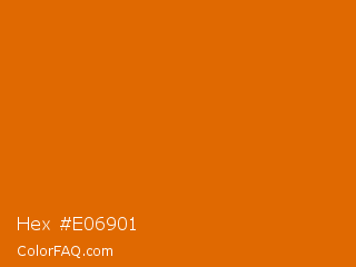 Hex #e06901 Color is a normal orange color and the nearest color is Bamboo #da6304. Hex code #e06901 and RGB value is rgb(224,105,1). In RGB color space, this color is composed of 88% red, 41% green, 0% blue, In CMYK color space, this color is composed of 0% cyan, 53% magenta, 100% yellow , 12% black , In HSL color space, this color has a hue angle of 28° , 99% saturation and 44% lightness.