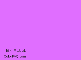 Hex #e06eff Color is a light purple color and the nearest color is Heliotrope #df73ff. Hex code #e06eff and RGB value is rgb(224,110,255). In RGB color space, this color is composed of 88% red, 43% green, 100% blue, In CMYK color space, this color is composed of 12% cyan, 57% magenta, 0% yellow , 0% black , In HSL color space, this color has a hue angle of 287° , 100% saturation and 72% lightness.