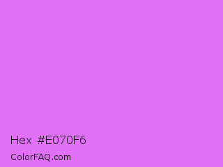 Hex #e070f6 Color is a light purple color and the nearest color is Heliotrope #df73ff. Hex code #e070f6 and RGB value is rgb(224,112,246). In RGB color space, this color is composed of 88% red, 44% green, 96% blue, In CMYK color space, this color is composed of 9% cyan, 54% magenta, 0% yellow , 4% black , In HSL color space, this color has a hue angle of 290° , 88% saturation and 70% lightness.