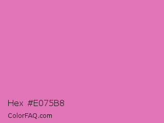 Hex #e075b8 Color is a light magenta color and the nearest color is Middle Purple #d982b5. Hex code #e075b8 and RGB value is rgb(224,117,184). In RGB color space, this color is composed of 88% red, 46% green, 72% blue, In CMYK color space, this color is composed of 0% cyan, 48% magenta, 18% yellow , 12% black , In HSL color space, this color has a hue angle of 322° , 63% saturation and 67% lightness.