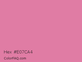 Hex #e07ca4 Color is a light rose color and the nearest color is Thulian Pink #de6fa1. Hex code #e07ca4 and RGB value is rgb(224,124,164). In RGB color space, this color is composed of 88% red, 49% green, 64% blue, In CMYK color space, this color is composed of 0% cyan, 45% magenta, 27% yellow , 12% black , In HSL color space, this color has a hue angle of 336° , 62% saturation and 68% lightness.