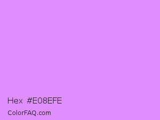 Hex #e08efe Color is a light purple color and the nearest color is Bright Lilac #d891ef. Hex code #e08efe and RGB value is rgb(224,142,254). In RGB color space, this color is composed of 88% red, 56% green, 100% blue, In CMYK color space, this color is composed of 12% cyan, 44% magenta, 0% yellow , 0% black , In HSL color space, this color has a hue angle of 284° , 98% saturation and 78% lightness.