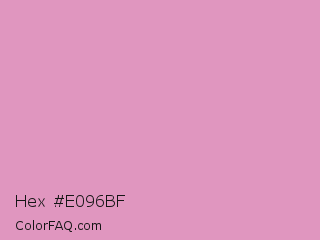 Hex #e096bf Color is a light magenta color and the nearest color is Shocking #e292c0. Hex code #e096bf and RGB value is rgb(224,150,191). In RGB color space, this color is composed of 88% red, 59% green, 75% blue, In CMYK color space, this color is composed of 0% cyan, 33% magenta, 15% yellow , 12% black , In HSL color space, this color has a hue angle of 327° , 54% saturation and 73% lightness.