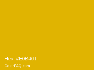 Hex #e0b401 Color is a normal yellow color and the nearest color is Galliano #dcb20c. Hex code #e0b401 and RGB value is rgb(224,180,1). In RGB color space, this color is composed of 88% red, 71% green, 0% blue, In CMYK color space, this color is composed of 0% cyan, 20% magenta, 100% yellow , 12% black , In HSL color space, this color has a hue angle of 48° , 99% saturation and 44% lightness.