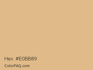 Hex #e0bb89 Color is a light orange color and the nearest color is Burlywood #deb887. Hex code #e0bb89 and RGB value is rgb(224,187,137). In RGB color space, this color is composed of 88% red, 73% green, 54% blue, In CMYK color space, this color is composed of 0% cyan, 17% magenta, 39% yellow , 12% black , In HSL color space, this color has a hue angle of 34° , 58% saturation and 71% lightness.