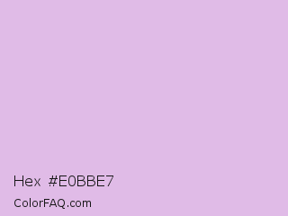 Hex #e0bbe7 Color is a very light purple color and the nearest color is Prelude #d0c0e5. Hex code #e0bbe7 and RGB value is rgb(224,187,231). In RGB color space, this color is composed of 88% red, 73% green, 91% blue, In CMYK color space, this color is composed of 3% cyan, 19% magenta, 0% yellow , 9% black , In HSL color space, this color has a hue angle of 290° , 48% saturation and 82% lightness.