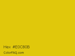 Hex #e0c80b Color is a normal yellow color and the nearest color is Citrine #e4d00a. Hex code #e0c80b and RGB value is rgb(224,200,11). In RGB color space, this color is composed of 88% red, 78% green, 4% blue, In CMYK color space, this color is composed of 0% cyan, 11% magenta, 95% yellow , 12% black , In HSL color space, this color has a hue angle of 53° , 91% saturation and 46% lightness.