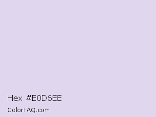 Hex #e0d6ee Color is a very light violet color and the nearest color is Snuff #e2d8ed. Hex code #e0d6ee and RGB value is rgb(224,214,238). In RGB color space, this color is composed of 88% red, 84% green, 93% blue, In CMYK color space, this color is composed of 6% cyan, 10% magenta, 0% yellow , 7% black , In HSL color space, this color has a hue angle of 265° , 41% saturation and 89% lightness.