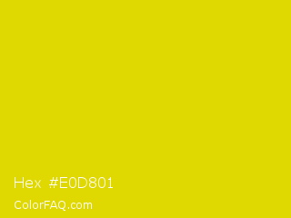 Hex #e0d801 Color is a normal yellow color and the nearest color is Peridot #e6e200. Hex code #e0d801 and RGB value is rgb(224,216,1). In RGB color space, this color is composed of 88% red, 85% green, 0% blue, In CMYK color space, this color is composed of 0% cyan, 4% magenta, 100% yellow , 12% black , In HSL color space, this color has a hue angle of 58° , 99% saturation and 44% lightness.
