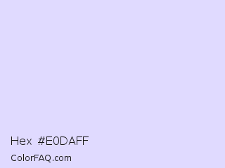 Hex #e0daff Color is a very light indigo color and the nearest color is Pale Lavender #dcd0ff. Hex code #e0daff and RGB value is rgb(224,218,255). In RGB color space, this color is composed of 88% red, 85% green, 100% blue, In CMYK color space, this color is composed of 12% cyan, 15% magenta, 0% yellow , 0% black , In HSL color space, this color has a hue angle of 250° , 100% saturation and 93% lightness.