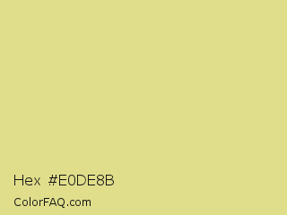 Hex #e0de8b Color is a light yellow color and the nearest color is Wild Rice #ece090. Hex code #e0de8b and RGB value is rgb(224,222,139). In RGB color space, this color is composed of 88% red, 87% green, 55% blue, In CMYK color space, this color is composed of 0% cyan, 1% magenta, 38% yellow , 12% black , In HSL color space, this color has a hue angle of 59° , 58% saturation and 71% lightness.