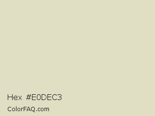 Hex #e0dec3 Color is a very light yellow color and the nearest color is Tana #d9dcc1. Hex code #e0dec3 and RGB value is rgb(224,222,195). In RGB color space, this color is composed of 88% red, 87% green, 76% blue, In CMYK color space, this color is composed of 0% cyan, 1% magenta, 13% yellow , 12% black , In HSL color space, this color has a hue angle of 56° , 32% saturation and 82% lightness.