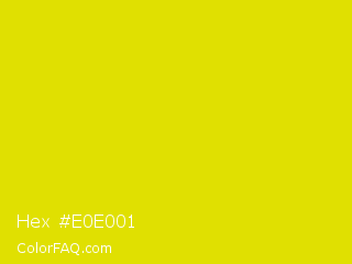 Hex #e0e001 Color is a normal yellow color and the nearest color is Peridot #e6e200. Hex code #e0e001 and RGB value is rgb(224,224,1). In RGB color space, this color is composed of 88% red, 88% green, 0% blue, In CMYK color space, this color is composed of 0% cyan, 0% magenta, 100% yellow , 12% black , In HSL color space, this color has a hue angle of 60° , 99% saturation and 44% lightness.