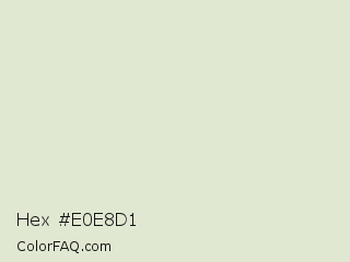 Hex #e0e8d1 Color is a very light green color and the nearest color is Kidnapper #e1ead4. Hex code #e0e8d1 and RGB value is rgb(224,232,209). In RGB color space, this color is composed of 88% red, 91% green, 82% blue, In CMYK color space, this color is composed of 3% cyan, 0% magenta, 10% yellow , 9% black , In HSL color space, this color has a hue angle of 81° , 33% saturation and 86% lightness.
