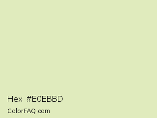 Hex #e0ebbd Color is a very light lime color and the nearest color is Beryl Green #dee5c0. Hex code #e0ebbd and RGB value is rgb(224,235,189). In RGB color space, this color is composed of 88% red, 92% green, 74% blue, In CMYK color space, this color is composed of 5% cyan, 0% magenta, 20% yellow , 8% black , In HSL color space, this color has a hue angle of 74° , 53% saturation and 83% lightness.