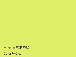 Hex #e0ef6a Color is a light yellow color and the nearest color is Booger Buster #dde26a. Hex code #e0ef6a and RGB value is rgb(224,239,106). In RGB color space, this color is composed of 88% red, 94% green, 42% blue, In CMYK color space, this color is composed of 6% cyan, 0% magenta, 56% yellow , 6% black , In HSL color space, this color has a hue angle of 67° , 81% saturation and 68% lightness.