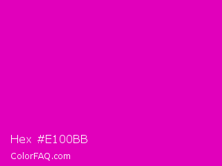 Hex #e100bb Color is a normal magenta color and the nearest color is Deep Magenta #cc00cc. Hex code #e100bb and RGB value is rgb(225,0,187). In RGB color space, this color is composed of 88% red, 0% green, 73% blue, In CMYK color space, this color is composed of 0% cyan, 100% magenta, 17% yellow , 12% black , In HSL color space, this color has a hue angle of 310° , 100% saturation and 44% lightness.