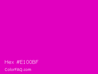 Hex #e100bf Color is a normal magenta color and the nearest color is Deep Magenta #cc00cc. Hex code #e100bf and RGB value is rgb(225,0,191). In RGB color space, this color is composed of 88% red, 0% green, 75% blue, In CMYK color space, this color is composed of 0% cyan, 100% magenta, 15% yellow , 12% black , In HSL color space, this color has a hue angle of 309° , 100% saturation and 44% lightness.