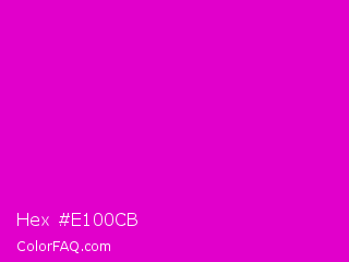 Hex #e100cb Color is a normal magenta color and the nearest color is Deep Magenta #cc00cc. Hex code #e100cb and RGB value is rgb(225,0,203). In RGB color space, this color is composed of 88% red, 0% green, 80% blue, In CMYK color space, this color is composed of 0% cyan, 100% magenta, 10% yellow , 12% black , In HSL color space, this color has a hue angle of 306° , 100% saturation and 44% lightness.