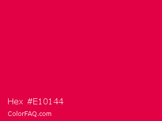 Hex #e10144 Color is a normal rose color and the nearest color is Rich Carmine #d70040. Hex code #e10144 and RGB value is rgb(225,1,68). In RGB color space, this color is composed of 88% red, 0% green, 27% blue, In CMYK color space, this color is composed of 0% cyan, 100% magenta, 70% yellow , 12% black , In HSL color space, this color has a hue angle of 342° , 99% saturation and 44% lightness.