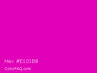 Hex #e101b8 Color is a normal magenta color and the nearest color is Deep Magenta #cc00cc. Hex code #e101b8 and RGB value is rgb(225,1,184). In RGB color space, this color is composed of 88% red, 0% green, 72% blue, In CMYK color space, this color is composed of 0% cyan, 100% magenta, 18% yellow , 12% black , In HSL color space, this color has a hue angle of 311° , 99% saturation and 44% lightness.