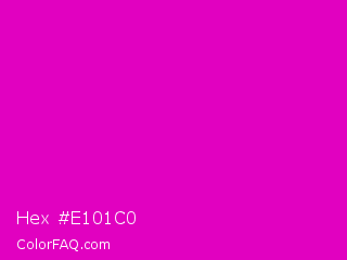 Hex #e101c0 Color is a normal magenta color and the nearest color is Deep Magenta #cc00cc. Hex code #e101c0 and RGB value is rgb(225,1,192). In RGB color space, this color is composed of 88% red, 0% green, 75% blue, In CMYK color space, this color is composed of 0% cyan, 100% magenta, 15% yellow , 12% black , In HSL color space, this color has a hue angle of 309° , 99% saturation and 44% lightness.