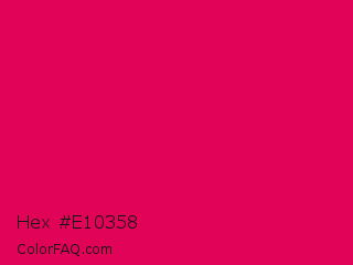 Hex #e10358 Color is a normal rose color and the nearest color is Razzmatazz Crayola #e30b5c. Hex code #e10358 and RGB value is rgb(225,3,88). In RGB color space, this color is composed of 88% red, 1% green, 35% blue, In CMYK color space, this color is composed of 0% cyan, 99% magenta, 61% yellow , 12% black , In HSL color space, this color has a hue angle of 337° , 97% saturation and 45% lightness.