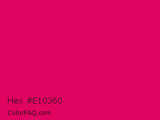 Hex #e10360 Color is a normal rose color and the nearest color is Raspberry #e30b5d. Hex code #e10360 and RGB value is rgb(225,3,96). In RGB color space, this color is composed of 88% red, 1% green, 38% blue, In CMYK color space, this color is composed of 0% cyan, 99% magenta, 57% yellow , 12% black , In HSL color space, this color has a hue angle of 335° , 97% saturation and 45% lightness.