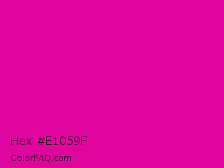 Hex #e1059f Color is a normal magenta color and the nearest color is Hollywood Cerise #f400a1. Hex code #e1059f and RGB value is rgb(225,5,159). In RGB color space, this color is composed of 88% red, 2% green, 62% blue, In CMYK color space, this color is composed of 0% cyan, 98% magenta, 29% yellow , 12% black , In HSL color space, this color has a hue angle of 318° , 96% saturation and 45% lightness.