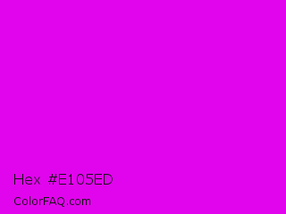 Hex #e105ed Color is a normal magenta color and the nearest color is Phlox #df00ff. Hex code #e105ed and RGB value is rgb(225,5,237). In RGB color space, this color is composed of 88% red, 2% green, 93% blue, In CMYK color space, this color is composed of 5% cyan, 98% magenta, 0% yellow , 7% black , In HSL color space, this color has a hue angle of 297° , 96% saturation and 47% lightness.