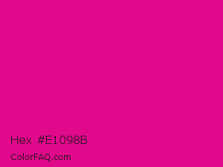 Hex #e1098b Color is a normal magenta color and the nearest color is Mexican Pink #e4007c. Hex code #e1098b and RGB value is rgb(225,9,139). In RGB color space, this color is composed of 88% red, 4% green, 55% blue, In CMYK color space, this color is composed of 0% cyan, 96% magenta, 38% yellow , 12% black , In HSL color space, this color has a hue angle of 324° , 92% saturation and 46% lightness.