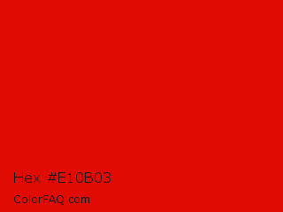 Hex #e10b03 Color is a normal red color and the nearest color is KU Crimson #e8000d. Hex code #e10b03 and RGB value is rgb(225,11,3). In RGB color space, this color is composed of 88% red, 4% green, 1% blue, In CMYK color space, this color is composed of 0% cyan, 95% magenta, 99% yellow , 12% black , In HSL color space, this color has a hue angle of 2° , 97% saturation and 45% lightness.