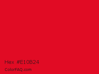 Hex #e10b24 Color is a normal red color and the nearest color is Medium Candy Apple Red #e2062c. Hex code #e10b24 and RGB value is rgb(225,11,36). In RGB color space, this color is composed of 88% red, 4% green, 14% blue, In CMYK color space, this color is composed of 0% cyan, 95% magenta, 84% yellow , 12% black , In HSL color space, this color has a hue angle of 353° , 91% saturation and 46% lightness.