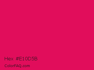 Hex #e10d5b Color is a normal rose color and the nearest color is Razzmatazz Crayola #e30b5c. Hex code #e10d5b and RGB value is rgb(225,13,91). In RGB color space, this color is composed of 88% red, 5% green, 36% blue, In CMYK color space, this color is composed of 0% cyan, 94% magenta, 60% yellow , 12% black , In HSL color space, this color has a hue angle of 338° , 89% saturation and 47% lightness.