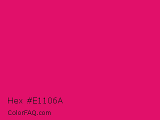 Hex #e1106a Color is a normal rose color and the nearest color is Ruby #e0115f. Hex code #e1106a and RGB value is rgb(225,16,106). In RGB color space, this color is composed of 88% red, 6% green, 42% blue, In CMYK color space, this color is composed of 0% cyan, 93% magenta, 53% yellow , 12% black , In HSL color space, this color has a hue angle of 334° , 87% saturation and 47% lightness.