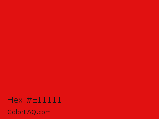 Hex #e11111 Color is a normal red color and the nearest color is KU Crimson #e8000d. Hex code #e11111 and RGB value is rgb(225,17,17). In RGB color space, this color is composed of 88% red, 7% green, 7% blue, In CMYK color space, this color is composed of 0% cyan, 92% magenta, 92% yellow , 12% black , In HSL color space, this color has a hue angle of 0° , 86% saturation and 47% lightness.