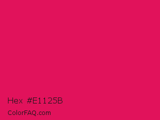 Hex #e1125b Color is a normal rose color and the nearest color is Ruby #e0115f. Hex code #e1125b and RGB value is rgb(225,18,91). In RGB color space, this color is composed of 88% red, 7% green, 36% blue, In CMYK color space, this color is composed of 0% cyan, 92% magenta, 60% yellow , 12% black , In HSL color space, this color has a hue angle of 339° , 85% saturation and 48% lightness.