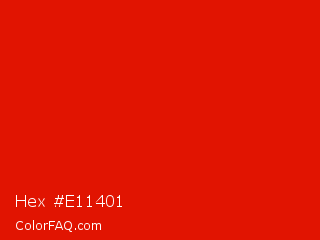 Hex #e11401 Color is a normal red color and the nearest color is Rosso Corsa #d40000. Hex code #e11401 and RGB value is rgb(225,20,1). In RGB color space, this color is composed of 88% red, 8% green, 0% blue, In CMYK color space, this color is composed of 0% cyan, 91% magenta, 100% yellow , 12% black , In HSL color space, this color has a hue angle of 5° , 99% saturation and 44% lightness.