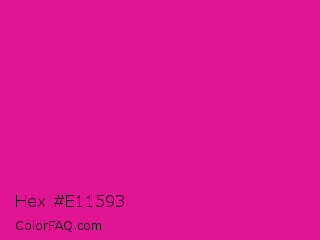 Hex #e11593 Color is a normal magenta color and the nearest color is Barbie Pink #e0218a. Hex code #e11593 and RGB value is rgb(225,21,147). In RGB color space, this color is composed of 88% red, 8% green, 58% blue, In CMYK color space, this color is composed of 0% cyan, 91% magenta, 35% yellow , 12% black , In HSL color space, this color has a hue angle of 323° , 83% saturation and 48% lightness.