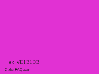 Hex #e131d3 Color is a normal magenta color and the nearest color is Steel Pink #cc33cc. Hex code #e131d3 and RGB value is rgb(225,49,211). In RGB color space, this color is composed of 88% red, 19% green, 83% blue, In CMYK color space, this color is composed of 0% cyan, 78% magenta, 6% yellow , 12% black , In HSL color space, this color has a hue angle of 305° , 75% saturation and 54% lightness.